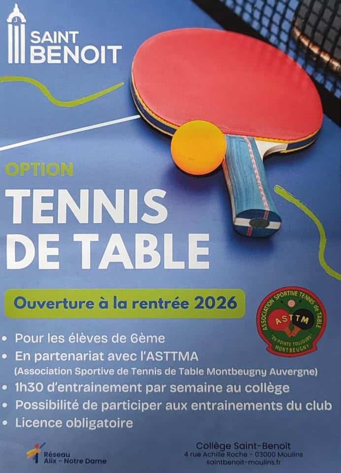 À partir de la rentrée scolaire 2026, le collège de Saint-Benoît proposera une nouvelle option sportive : le tennis de table, destinée aux élèves de 6ᵉ.